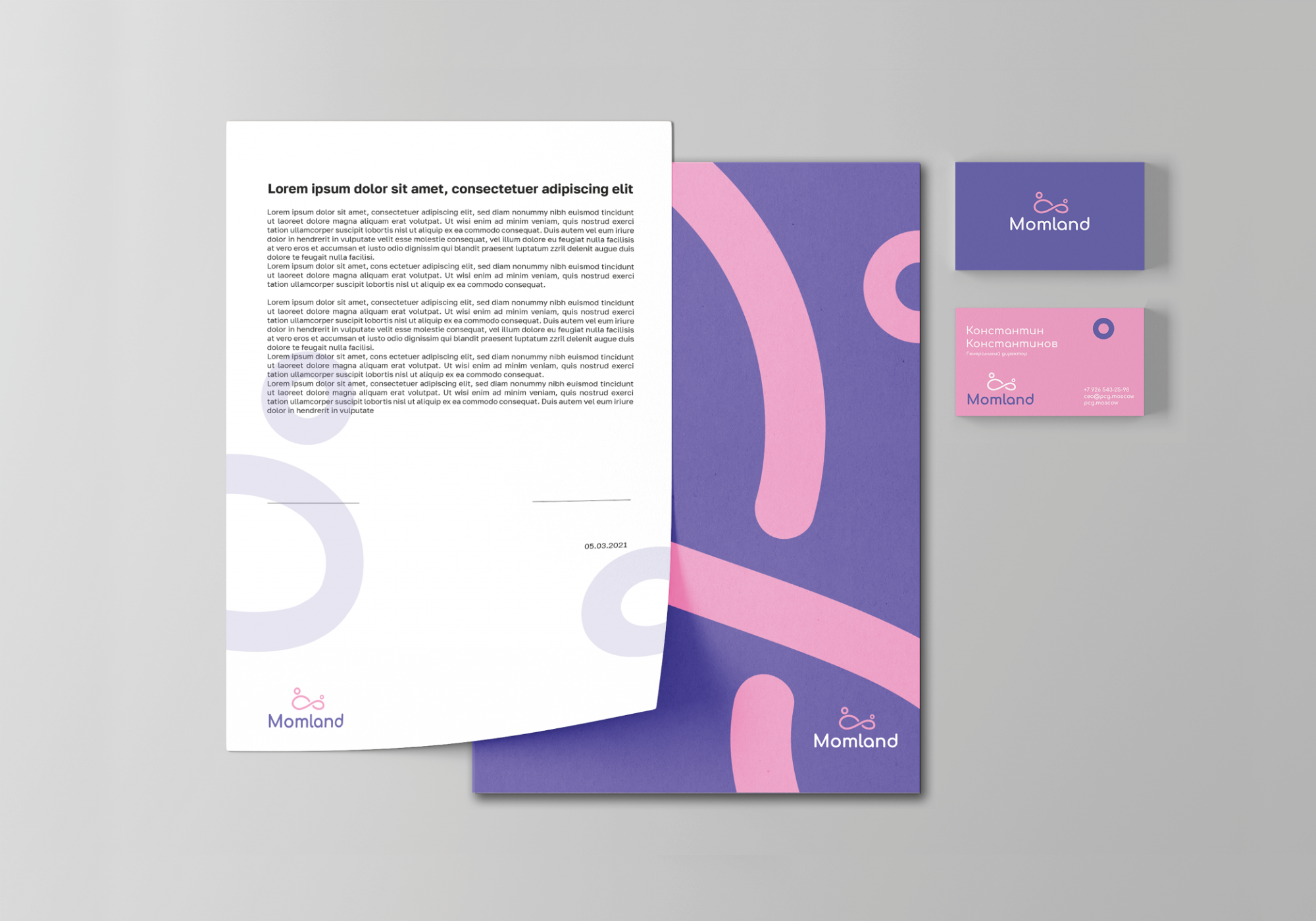 Товары бренда в основном имеют плавные формы, светлые тона и отличаются высокой технологичностью, поэтому в качестве основных цветов фирменного стиля мы выбрали белый, розовый и фиолетовый. Контрастные по отношению к белому цвета используется в постельном оттенке и символизируют нежность.